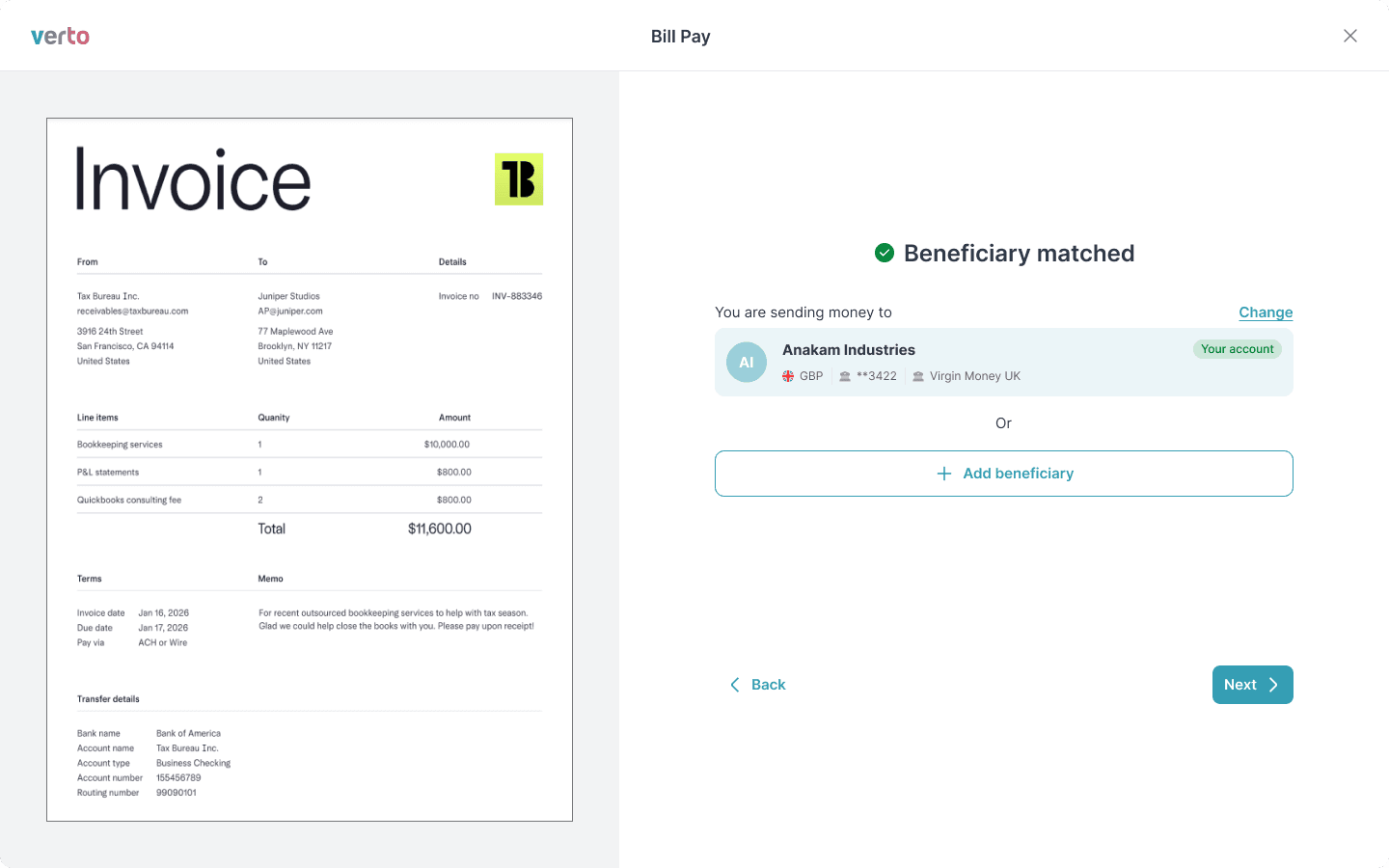 The system checks the invoice data against saved beneficiaries.