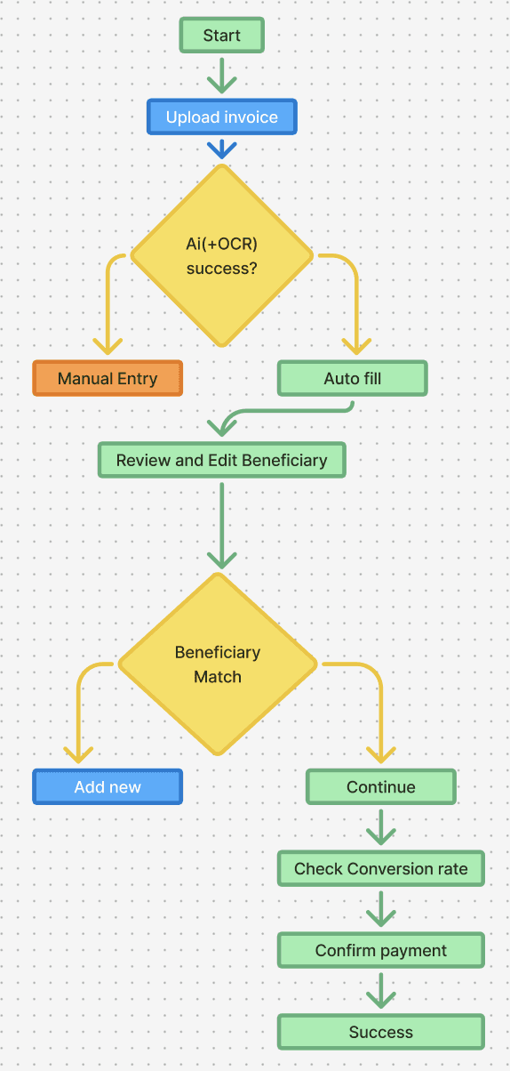 For a product that handles payments across currencies, beneficiaries, and compliance fields, the friction multiplied quickly. This was not scalable for SMBs handling dozens of invoices weekly.